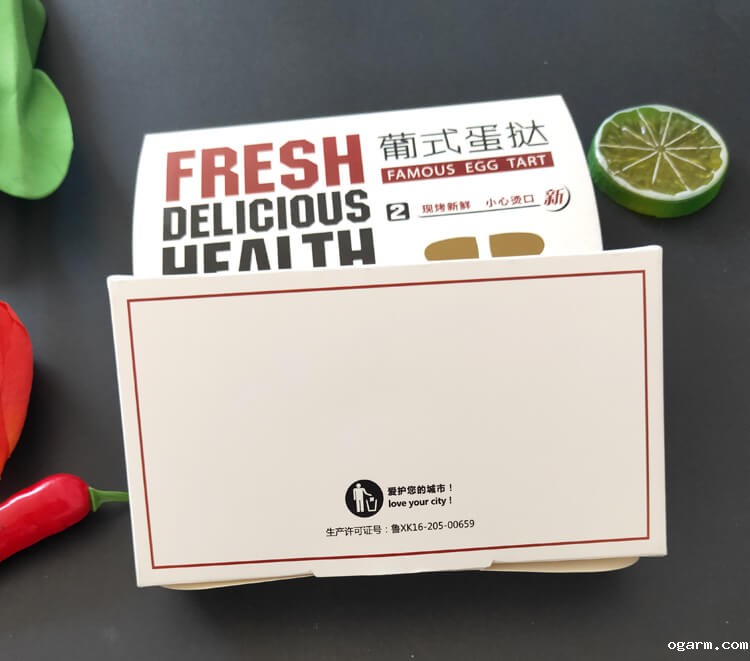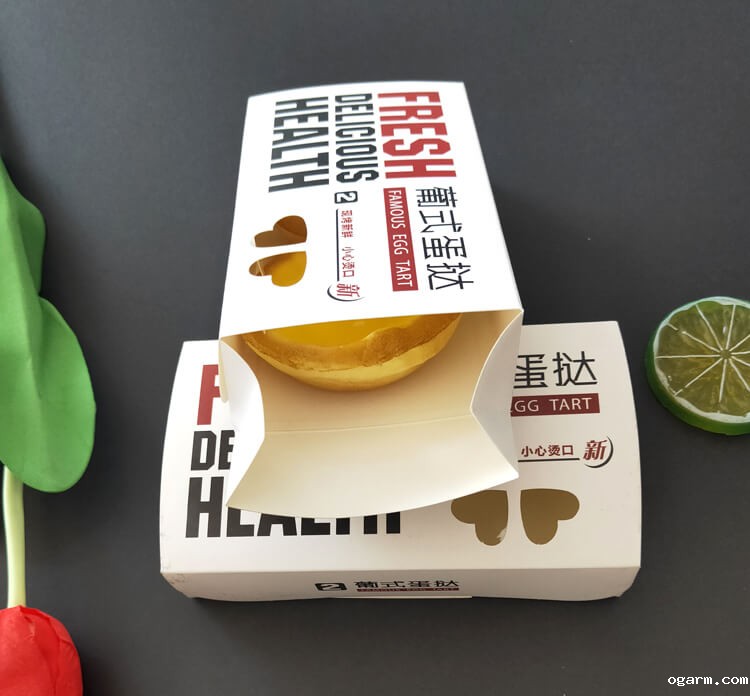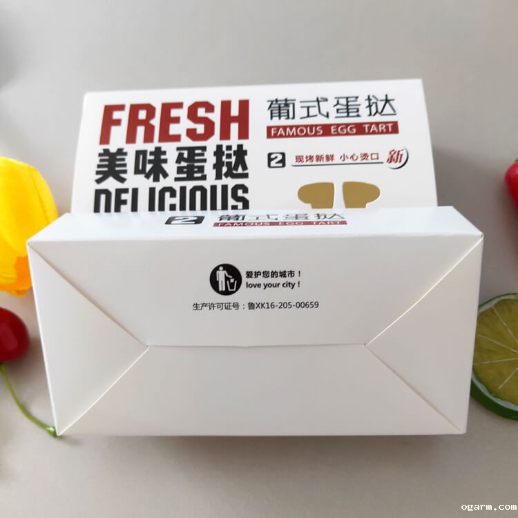1. 选择高质量的材料:蛋挞盒使用的纸板要选择质量好、强度高的材料,能够承受住蛋挞的重量和压力,不容易变形。